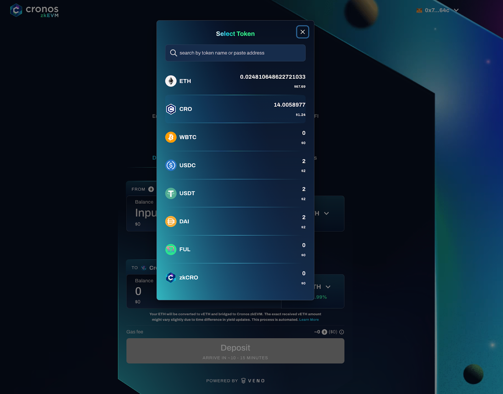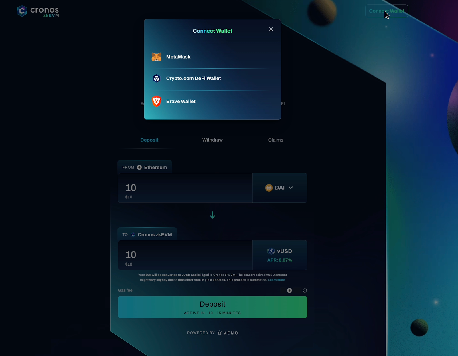 1. Head to <https://zkevm.cronos.org/bridge> and connect your wallet.