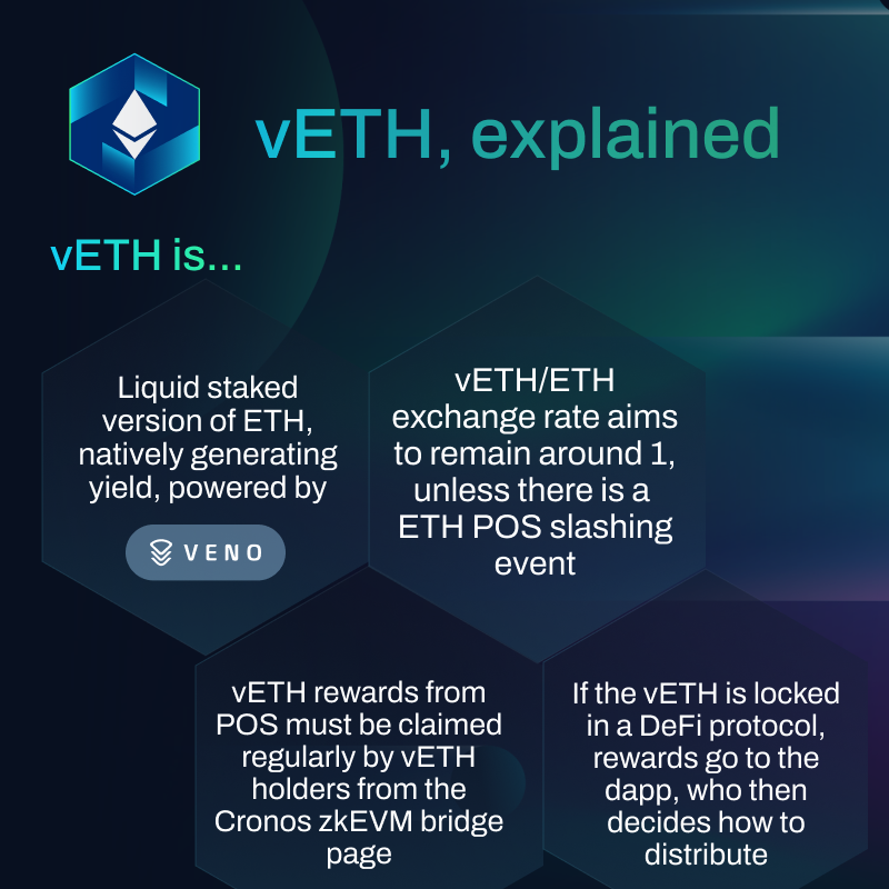 vETH is created by the decentralized Veno Finance protocol, in partnership with Cronos zkEVM.