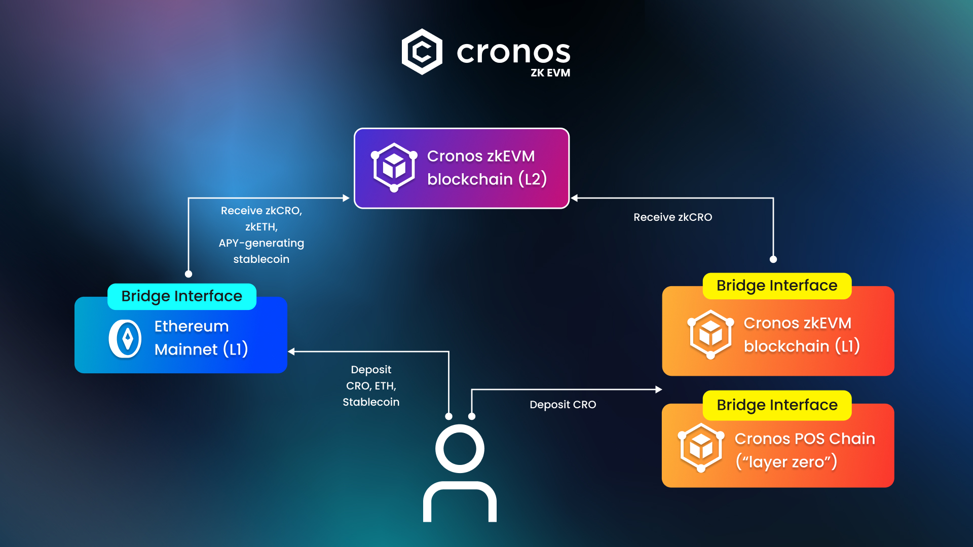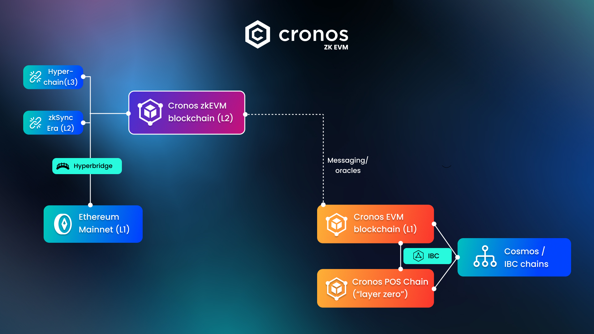 Integrated within the ZK Stack Hyperchain Ecosystem, it connects to the Ethereum Mainnet via a shared bridge, tapping into Ethereum's user base and security while incorporating zkSync's features for secure and efficient cross-chain interactions. As part of the wider Cronos ecosystem, Cronos zkEVM works in tandem with the Cronos blockchain (Layer 1 EVM) and the Cronos POS Chain.