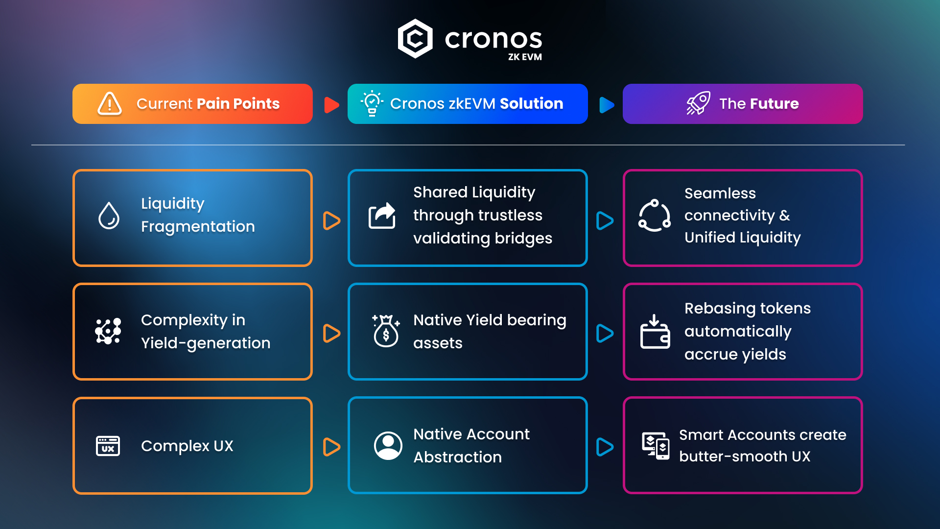 Cronos zkEVM targets key DeFi challenges by offering solutions for liquidity fragmentation, yield-generation complexity, and user experience barriers.